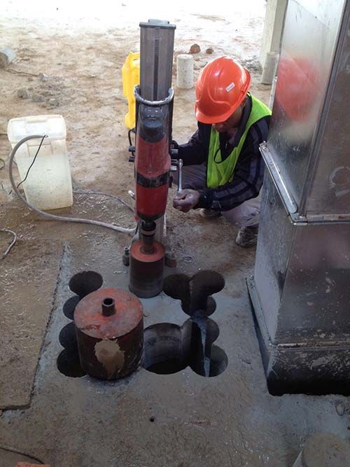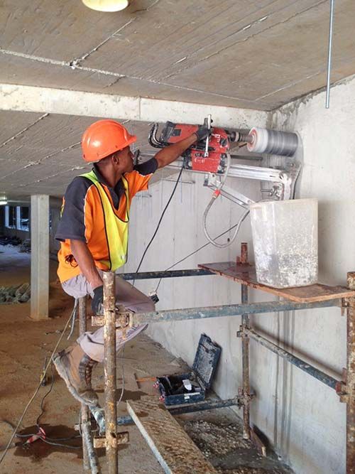 Our core drilling machines are able to drill holes ranging from 25mm to 400mm in diameter. These machines can drill vertically or horizontally and can drill circular holes through reinforced concrete, precast concrete, bricks, pavers, asphalt, rock and most other structural materials. Core drilling is used when precise smooth circular cuts are needed for Aircons, Ducting, Plumbing, Electrical Cabling, HVAC Installations, Anchoring Bolts, Dowl Bars, Analysing of Structures, Rock or Strata and more. We use diamond core drill bit blades cooled with water to eliminate the dust associated with the process of and drilling.